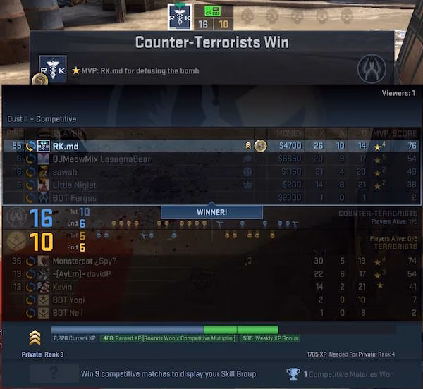 My achievement for the weekend – finally being eligible for competitive matches in Counter-Strike: Global Offensive and leading my team to victory in my first match ever. Witness the nerdiness.