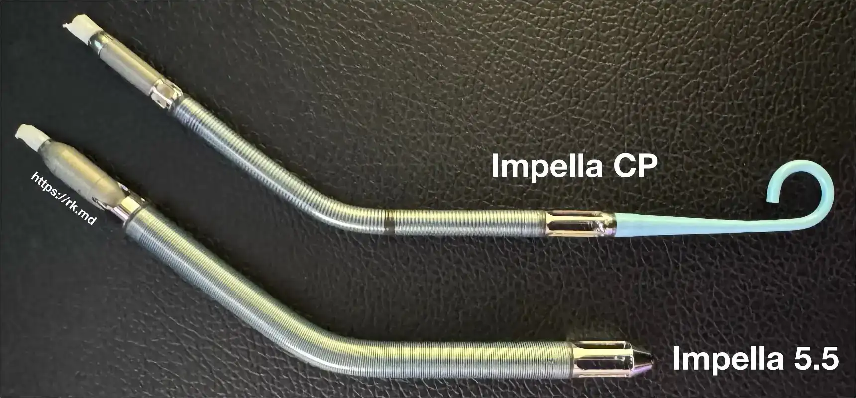Impella® is a percutaneous axial heart pump placed retrograde across the aortic valve into the left ventricle (LV) utilizing fluoroscopy +/- echocardiography. Its indications include high-risk percutaneous coronary intervention (PCI, especially cardiogenic shock or signs of ongoing ischemia), post-cardiotomy failure, and myocarditis. In addition, it is routinely used as a bridge between other forms of circulatory support like intra-aortic balloon pumps (IABP), ventricular assist devices (VAD), artificial hearts, and extracorporeal membrane oxygenation (ECMO). In 2014, the (underpowered) RECOVER RIGHT study showed benefits with the Impella RP device to help those with right-sided heart failure refractory to medical therapy. For this post, I’ll only discuss the traditional left-sided Impella.
