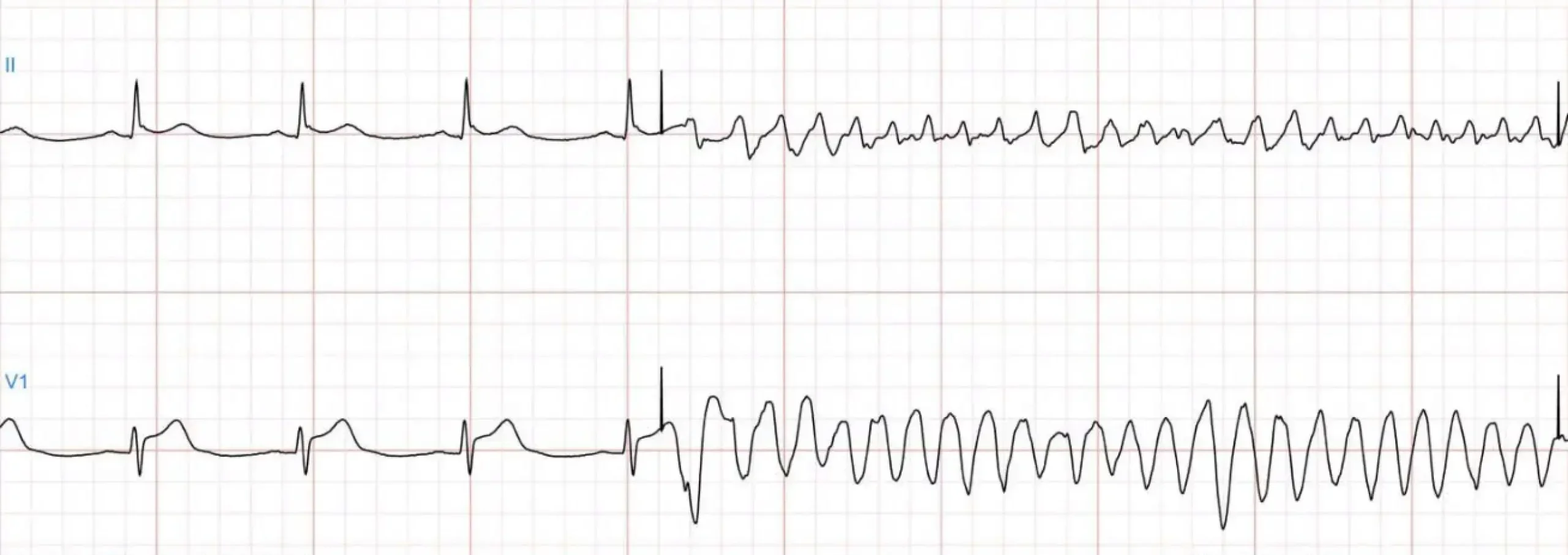 Here’s another example of R-on-T resulting in polymorphic ventricular tachycardia.