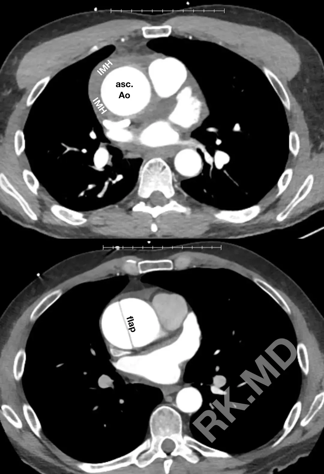 Whereas aortic dissection involves a tear in the intimal (innermost) layer of the aorta, allowing blood to enter the media and creating a false lumen bordered by the intimal flap, IMH is characterized by rupture of the vaso vasorum, leading to hematoma formation in the media layer without a resulting intimal flap. The gold standard for diagnosis (and differentiating the two) is gated CT angiography to evaluate the aortic wall and lumen. Either syndrome can progress to pericardial tamponade, involvement of the aortic valve or coronary arteries, and even aortic rupture.