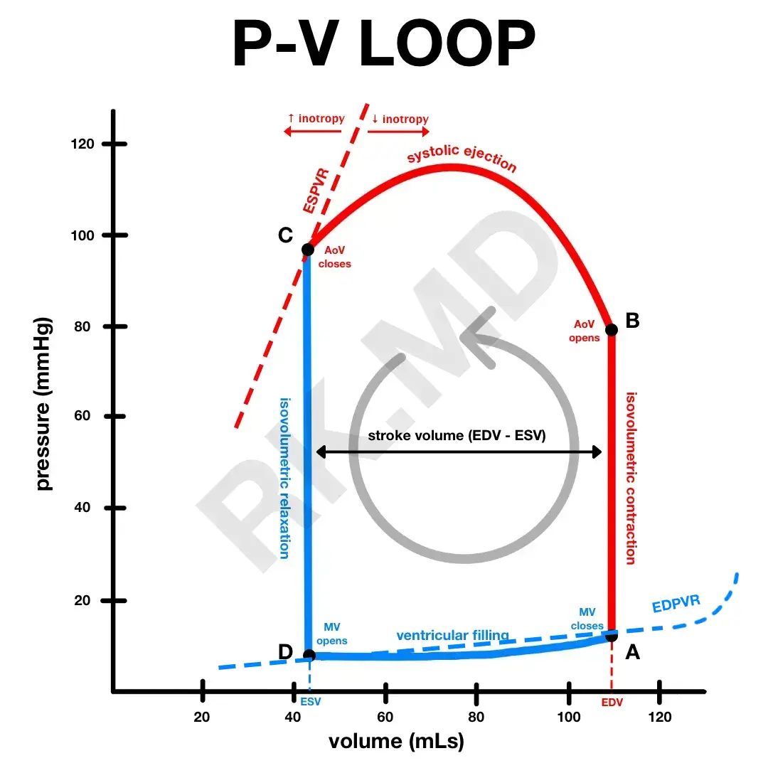 The left ventricle’s (LV) pressure-volume (P-V) loop visually represents an important relationship between the chamber’s pressure and volume over a single cardiac cycle. In the following diagram, systole is red, and diastole is blue. The P-V loop consists of four events: